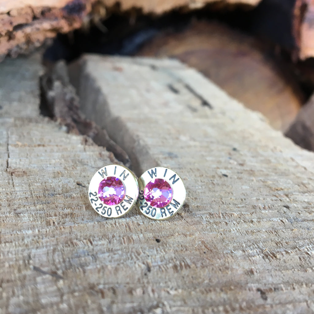All bullet slices are from spent/used ammunition meaning they are likely to have scratches/ indentations from firing. While this changes the bullet shape/dimension after firing, we try our best to pair cases similar for earrings and cuff links. Swarovski Crystals are our chosen gem. We try to fit them as best as possible, but as stated above, with used casings- they can go out of shape.
